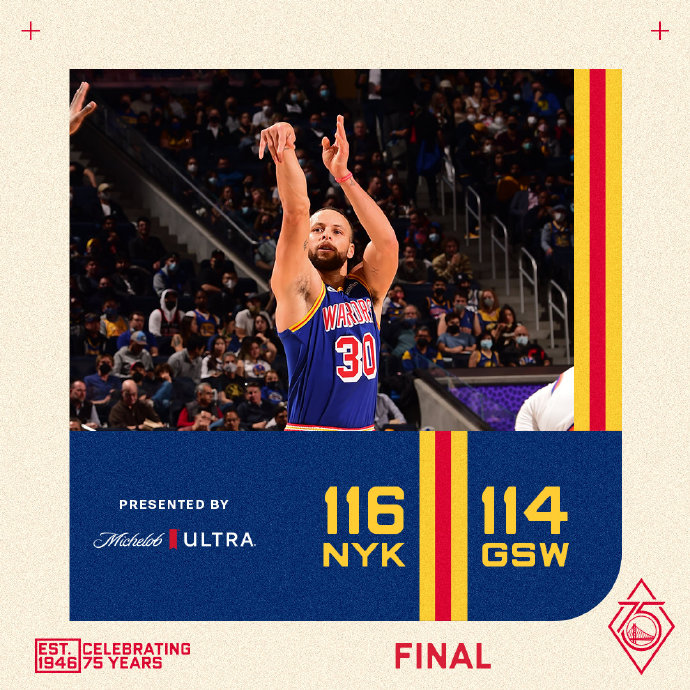 24直播网2月11日讯 勇士今日回到主场迎来尼克斯的挑战,勇士上一场不敌爵士结束9连胜,尼克斯则遭遇4连败表现低迷。首节之争尼克斯“扮猪吃老虎”一路维持着不错的进攻状态,节末轮换他们抓住对手衔接段不能得分的机会下起三分雨并反超取得5分领先,次节成为库里的表演时间,这位首节仅得2分的超级球星在第二节独砍17分,一人拿下球队这一节一半得分帮助勇士反超5分进入下半场。第三节尼克斯再一次发动反扑,他们开局一波11-0的攻势迅速反超比分,随后面对勇士的反扑,兰德尔梦回上个赛季单节砍下11分守住领先,末节开局尼克斯再送9-2的攻势一度取得两位数领先,勇士虽然一直扮演追分角色但也能够凭借稳定输出不断蚕食分差,不过撤下卢尼导致不断丢篮板,而兰德尔最后时刻打进制胜进球杀死比赛。最终,尼克斯险胜勇士结束4连败,勇士则遭遇2连败。