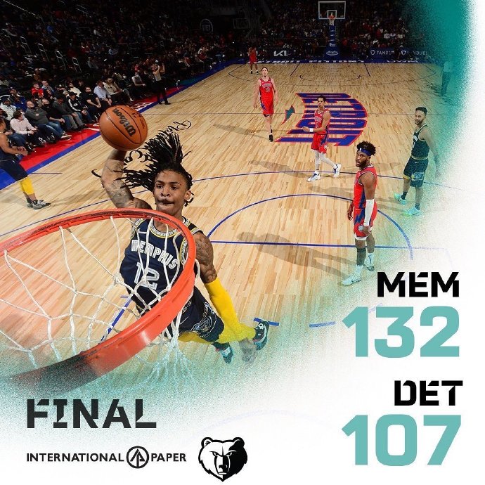 灰熊(39-18):莫兰特23分6助攻4篮板、贝恩22分6篮板2助攻、亚当斯16分14篮板5助攻、克拉克14分9篮板3助攻、梅尔顿14分4篮板3助攻、安德森13分10篮板2助攻、小贾伦12分6篮板2助攻、扎伊尔-威廉姆斯8分2助攻、卡尔弗5分、康查尔3分4篮板、琼斯2分5助攻2抢断