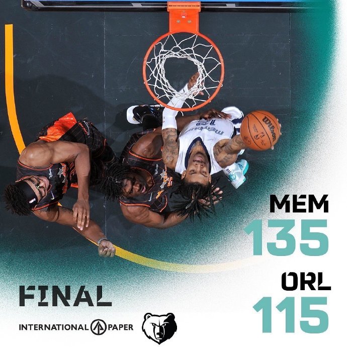 灰熊(37-18):莫兰特33分7助攻5篮板2盖帽、小贾伦21分6篮板、梅尔顿16分10篮板2助攻、亚当斯12分11篮板8助攻、扎伊尔-威廉姆斯11分2助攻、克拉克10分8篮板3助攻、琼斯10分5助攻、贝恩7分8篮板3助攻、安德森7分6篮板2盖帽、蒂尔曼5分2篮板、康查尔3分3篮板2助攻