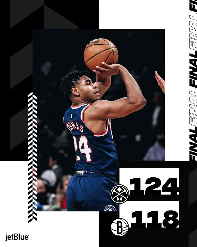 篮网(29-19):托马斯25分、阿尔德里奇18分8板、米尔斯21分3板6助、本布里14分3板3助、卡特13分3助、詹姆斯-约翰逊12分8板7助3断