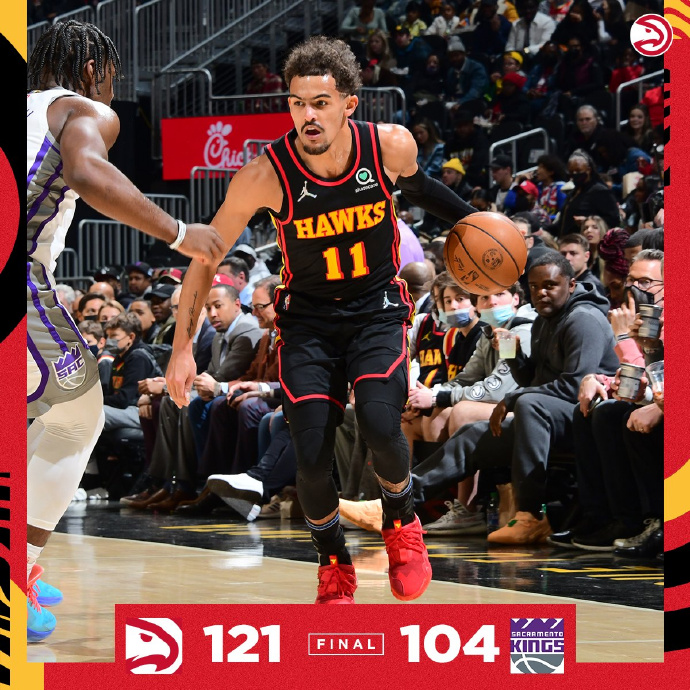 24直播网1月27日讯 NBA常规赛继续进行,老鹰坐镇主场迎战国王,此前老鹰获得四连胜,国王则在遭遇四连败,此役福克斯等人缺阵。比赛上来米切尔手感火热,四投四中帮助国王建立领先优势,老鹰这边则手感不佳,分差很快被拉大到两位数,首节结束国王33-21暂时领先。次节回来,奥孔武连续在篮下暴扣取分,博格丹手感火热,外线连续命中帮助老鹰追平并反超比分,米切尔和巴恩斯连中三分止血,但本节最后三分钟国王没有再得分,老鹰这边则是愈战愈勇,特雷-杨准压哨超远三分命中后,老鹰单节46-17净胜29分,半场结束67-50领先。易边再战,老鹰这边延续手感,分差很快被进一步拉大,特雷-杨超远三分飙中后,分差一度来到30分,随后国王状态回暖,打出一波13-2缩小分差,三节结束老鹰94-74领先。末节特雷-杨等老鹰主力没有再上场,两队交替取分,国王每次缩小比分,老鹰总能作出回应,最终老鹰主场121-104大胜国王,取得五连胜的同时送给对方五连败。