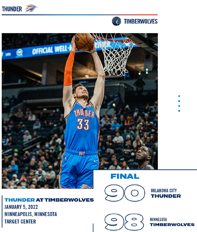 24直播网01月06日讯 NBA常规赛继续进行,雷霆客场挑战森林狼。雷霆本赛季依旧以锻炼和培养新人为主,亚历山大和多特都有了长足的进步。森林狼目前位居西部第九,但距离第五的掘金也只有2个胜场差,在本赛季多队受到疫情影响的情况下,森林狼有机会趁乱杀入季后赛。唐斯、拉塞尔、亚历山大本场均迎来复出。一开场,雷霆全队梦游,失误打铁不断,贝弗利连中三分帮助森林狼取得两位数领先。雷霆单节出现10次失误,森林狼多点开花领先20分结束首节。次节比赛,雷霆迅速回暖,强攻篮下频频得手,将分差迫近到个位数,森林狼连中三分稳住局势,半场战罢森林狼49-36领先。易边再战,贝弗利先中两个三分,后半段雷霆奋力反击,打出10-0将分差缩小到个位数。三节打完森林狼领先6分。第四节,雷霆内外开花继续缩小分差,一度将分差缩小到7分。诺威尔挺身而出连得7分稳住局势,贝弗利也连投带罚拿到4分,森林狼力克雷霆取得胜利。