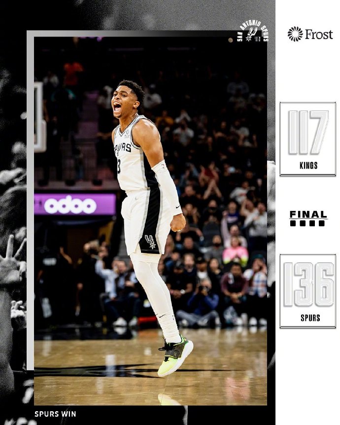 马刺(4-7):穆雷26分6篮板7助攻2抢断、瓦塞尔15分5篮板、赛迪斯-杨17分5篮板8助攻、麦克德莫特17分3篮板2助攻、尤班克斯18分6篮板2助攻、约翰逊8分13篮板4助攻2抢断、沃克15分、福布斯15分