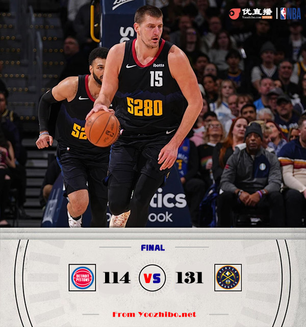 24直播网1月8日讯 NBA常规赛继续进行,掘金主场迎战活塞,掘金上场不敌魔术,目前25胜12负继续排在西部第三,活塞近期遭遇三连败后战绩来到3胜32负,继续排名东部垫底。首节一上来双方你来我往比分紧咬,穆雷火力全开单节独得10分,约基奇专注组织首节零出手,活塞连续杀伤内线给予回应,首节结束时掘金领先2分,次节回来,康宁汉姆左膝扭伤提前伤退,穆雷延续火力单节再度贡献14分,率领掘金连续发力扩大优势,半场战罢,掘金继续领先8分,易边再战后沃特森突然爆发连续取分,掘金单节狂轰43分一举拉开比分,三节结束后掘金已经领先23分,末节上来,掘金逐渐换上替补阵容,活塞主力阵容一度缩小分差,但掘金迅速回应终结悬念,最终掘金131-114大胜活塞送对手4连败。