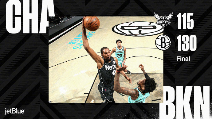 篮网(39-18):杜兰特25分3板11助、格林10分5助、乔-哈里斯26分3断、欧文12分4板6助3断、沙梅特20分、格里芬10分5板3助2断1帽