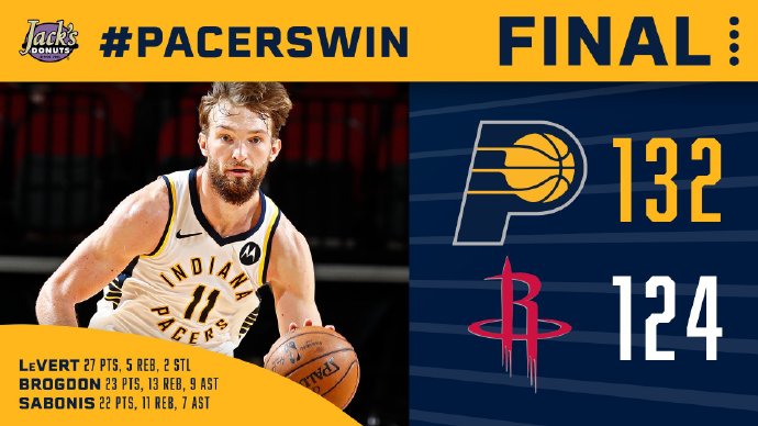 步行者(26-28):布罗格登23分13板9助,萨博尼斯22分11板7助,勒韦尔27分5板2断,麦康纳12分6板4助4断,J-兰姆18分,萨姆纳7分,J-霍勒迪5分3板2断2帽,A-霍乐迪4分3板,比塔泽4分5板3助,布里塞特10分