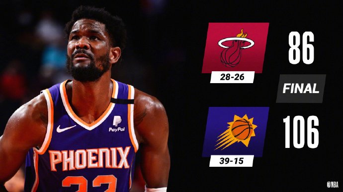 太阳(39-15):艾顿19分13板,布克12分3板3助,卡梅隆-约翰逊15分5板,佩恩14分6板7助,克雷格14分6板,萨里奇13分5板,卡特9分2板,保罗5分2板9助3断,克劳德5分6板。