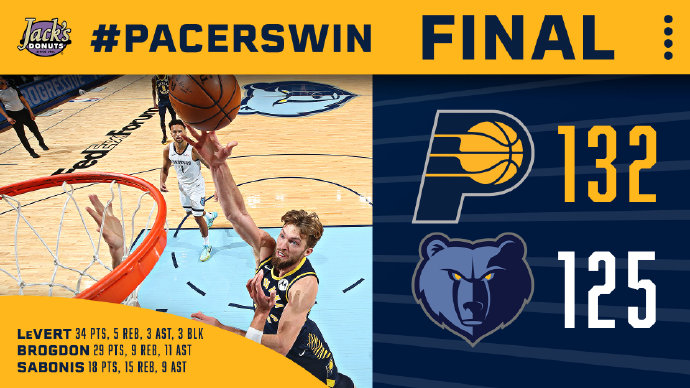 步行者(25-27):勒韦尔34分5篮板3助攻,布罗格登29分9篮板11助攻,萨博尼斯18分15篮板9助攻,萨姆纳11分,麦克德莫特13分4篮板2助攻,比塔泽7分6篮板,麦康纳10分5篮板4助攻,贾斯丁-霍勒迪5分5篮板5助攻2抢断