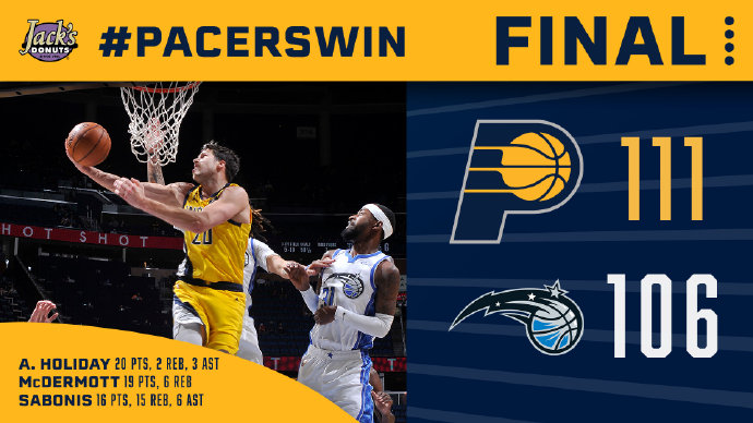 24直播网4月10日讯 今日NBA常规赛,步行者客场挑战魔术,加里-哈里斯首次代表魔术出战,萨博尼斯与布罗格登本场比赛迎来复出。比赛一开始,双方比分便陷入胶着,魔术连突内线取得领先,步行者则内外兼修始终紧咬比分,随着节末A-霍勒迪连续甩进两记三分,步行者领先魔术3分结束首节。第二节比赛后半段,魔术陷入得分荒,接连多次投篮打铁,步行者抓住机会打出一波11-0将比分扩大,半场结束64-51领先13分。易边再战,步行者进攻效率降低,魔术里突外投不断得分一度将分差缩小至3分,随着麦康纳压哨抛投得手,三节战罢,步行者83-78领先魔术5分。末节开始,步行者里突外投不断扩大领先优势,分差一度来到15分,魔术多次尝试反扑,但分差太大最终无力回天,步行者客场111-106战胜魔术。