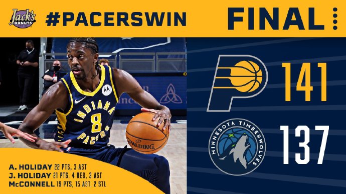 24直播网4月8日讯 今日NBA常规赛,步行者主场迎战森林狼,本场比赛步行者小萨博尼斯在内的多名主将缺战。比赛开始后,双方便进入对攻模式,森林狼内外兼修,而步行者则不断冲击内线始终紧咬比分,随着马丁反击断球打成二加一,步行者领先4分结束首节。次节回来后,森林狼进攻效率降低,连续投篮打铁,步行者则多点开花,抓住机会一度将分差扩大至21分。下半场回来后,森林狼找回进攻状态,唐斯里突外投连续得分,步行者则稳扎稳打始终保持十分以上领先优势,三节战罢,步行者109-94仍然保持15分领先。最后一节,爱德华兹率先发力连得7分,步行者外线发力接连命中3记三分,依靠外线火力浇灭森林狼反扑势头,最后时刻,麦康纳弧顶甩进压哨三分杀死比赛。最终,步行者141-137战胜森林狼捍卫主场。