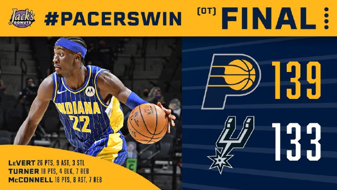 步行者(22-26):勒韦尔26分4板9助3断、麦康纳18分7板8助、A-霍勒迪18分3板3助、特纳18分7板4帽、萨姆纳15分6板3助、麦克德莫特10分、J-霍勒迪10分4板3断
