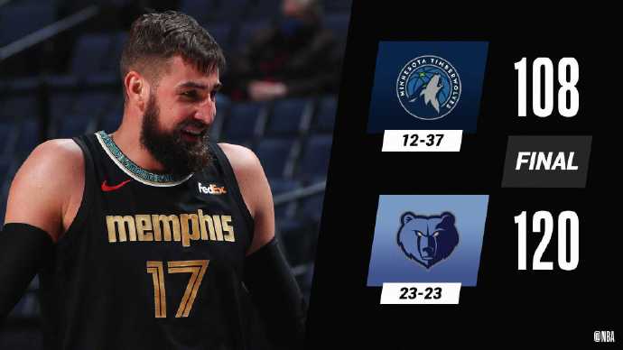 24直播网4月2日讯 灰熊坐镇主场迎战森林狼,目前灰熊排名西部第10,距离第8的马刺还有1.5个胜场,森林狼是他们冲击季后赛道路上必须拿下的对手,此役卢比奥因伤缺阵。首节两队开局势均力敌,森林狼虽然打出8-0的小高潮,但灰熊靠着替补球员给力的发挥还是将比分反超,次节灰熊一波15-3将分差扩大到两位数,然而顽强的森林狼却用一阵三分雨将劣势抹平。下半场,森林狼一度陷入4分多钟的得分荒,好在他们抓住瓦兰丘纳斯4犯下场之际打出15-5的攻击波完成反超,但灰熊却在末节多点开花打出23-6的攻击狂潮将分差拉大到20分以上,森林狼后继乏力未能顶住对手的猛攻,最终灰熊主场120-108击败森林狼,距离西部第8只有一步之遥。
