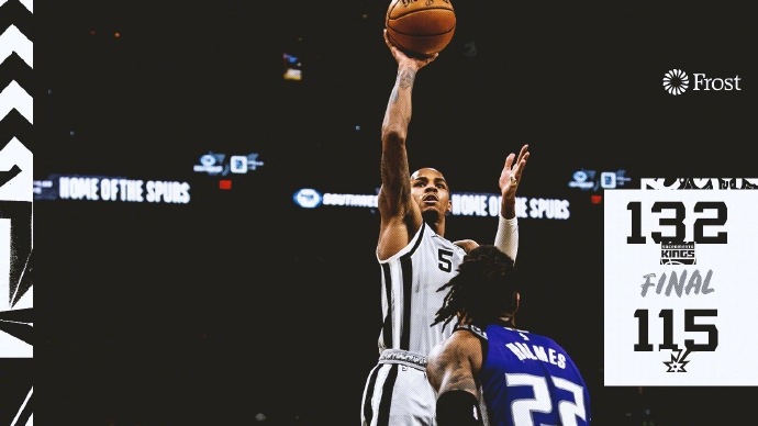 24直播网3月30日讯 NBA常规赛继续进行,马刺主场对阵国王。马刺目前排在西部第七,和阿德的友好分手也帮助后者加盟了夺冠热门篮网。国王虽然仅排在西部倒数第五,但近期取得了一波四连胜。一开场,国王多点开花,马刺依靠穆雷的个人能力咬住比分,马刺凭借末段的小高潮领先4分结束首节。次节比赛,国王连续外线开炮,凭借最后两分钟的8-0在半场结束时68-60取得领先。易边再战,国王率先发力一度将分差拉开到18分,德罗赞连投带罚缩小分差,三节打完国王领先6分。末节国王在福克斯的带领下扩大领先并保持到了最后。最终,国王客场战胜马刺,取得五连胜。