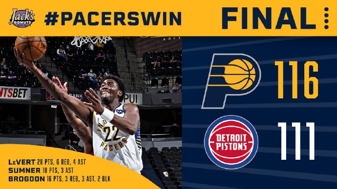 步行者:勒韦尔28分6板4助,萨博尼斯14分11板4助,霍勒迪14分3助3断,布罗格登16分3板3助,萨姆纳18分3助,麦康纳6分3板5助,兰姆7分2助,比塔泽9分5板;