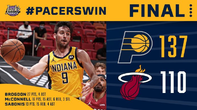 步行者(18-22):布罗格登27分3板4助,麦康纳16分15助6板,萨博尼斯13分15板4助,霍勒迪17分4板,特纳12分5板5帽,勒韦尔8分7助4板,比塔泽6分4板,兰姆12分2板,麦克德莫特17分2板3助,萨姆纳6分。
