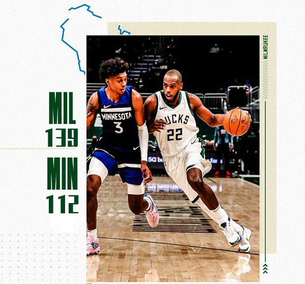 雄鹿:字母哥37分8板8助、米德尔顿15分、洛佩兹15分、奥古斯汀10分、迪温岑作13分、波蒂斯14分、福布斯23分