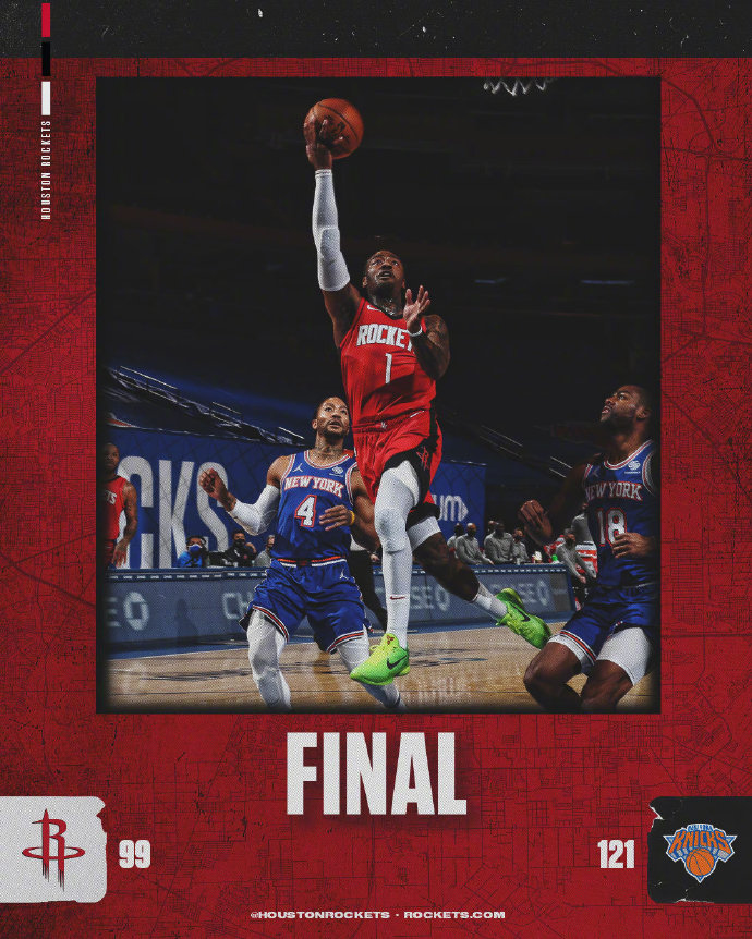 24直播网2月14日讯 NBA常规赛,尼克斯今日迎战火箭,前者上场比赛战胜奇才排在东部第八位,而后者已经遭遇四连败下滑至西部第十三位,本场奥拉迪波和伍德均因伤缺战。比赛上来两队经过短暂拉锯,不过暂停之后尼克斯便开始发力,尤其是外线连续命中远投,次节更是将分差拉大到了两位数。易边再战,火箭在沃尔的带领下一度将分差缩小回个位数,但并没能一举实现反超,稳住阵脚的尼克斯末节直接将分差扩大到了二十分以上,比赛彻底失去悬念,最终尼克斯大胜火箭,送给后者五连败。