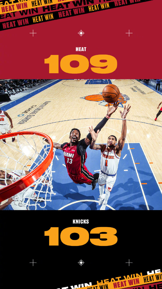 24直播网2月8日讯 NBA常规赛尼克斯主场对阵热火,尼克斯近来取得2连胜,热火则是仅排在东部倒数第三。开场后布洛克就手感火热连中三分帮助尼克斯取得领先,不过热火逐渐打出气势完成反超,第二节场上局势仍旧胶着,虽然尼克斯一度掀起反扑完成反超,但是阿德巴约和巴特勒仍旧帮助热火以60-59领先1分结束上半场。下半场回来两队手感再次回落,不过热火仍旧靠着三分稍稍拉开比分,虽然尼克斯穷追不舍,不过关键时刻巴特勒和阿德巴约仍旧帮助热火锁定胜局,最终热火109-103力克尼克斯。