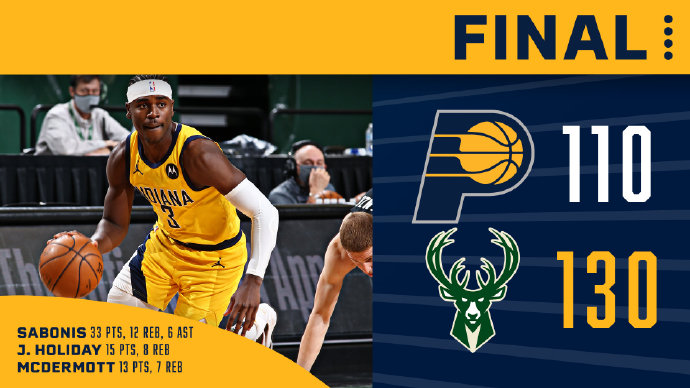 步行者:萨博尼斯33分12篮板6助攻,特纳3分2篮板2断,布罗格登12分3篮板3助攻2断,贾斯丁-霍勒迪15分8篮板1助攻2断,兰姆2分2篮板,麦克德莫特13分7篮板,桑普森3分3篮板,比塔泽6分5篮板,麦康纳6分12助攻2篮板,萨姆纳2分,阿隆-霍勒迪11分2助攻,凯兰-马丁4分