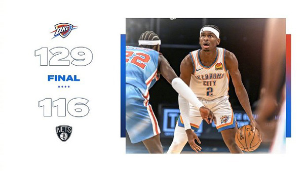 24直播网1月11日讯 雷霆今日迎战篮网,篮网队欧文继续缺战,好在杜兰特及时复出。比赛上来篮网由久疏战阵的杜兰特率先发起进攻,中距离跳投命中为球队率先拿到两分,首节凭借杜兰特的神勇发挥篮网领先12分,次节雷霆进攻有所好转,半场结束时雷霆将分差缩小到6分。易边再战,雷霆外线开始发力,罗比接连命中关键三分,雷霆也一举反超比分,三节结束时雷霆领先13分,进入末节,雷霆进攻火力不减分差一度来到20分,杜兰特回天无力,最终雷霆战胜篮网。