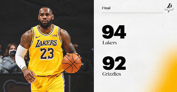 24直播网1月6日讯 NBA常规赛湖人对阵灰熊,湖人近来状态不错取得3连胜。开场后湖人利用快攻抢占先机,首节两队手感都比较一般,灰熊冲击内线追上比分,吉昂和蒂尔曼帮助球队完成反超。第二节上来湖人外线连中三分,接着场上局面陷入僵持,两队球队轮番打出表现,上半场结束时灰熊49-45领先湖人。下半场两队两队手感仍旧一般,詹姆斯一度帮助湖人反超比分,不过灰熊及时调整咬住比分,第四节场上局面仍旧胶着,最后关头詹眉两人先后发力在攻防两端帮助湖人锁定胜局,最终湖人力克灰熊取得4连胜。