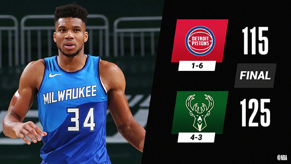 24直播网1月5日讯 NBA常规赛雄鹿主场对阵活塞,开场后字母哥就展现他的统治力接连拿分,活塞则不断用外线三分回应,雄鹿早早的建立领先,第二节上来雄鹿再次打出攻势,虽然活塞多点开花努力追分,但是他们完全无法阻挡住字母哥的发挥,上半场雄鹿67-56领先活塞。下半场回来字母哥仍旧状态神勇不断砍分,雄鹿也一直牢牢保持两位数领先,活塞无力缩小分差,最终雄鹿125-115轻松击败活塞。