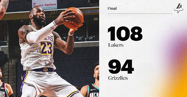 24直播网1月3日讯 湖人继续展开西南客场之旅,今天前往孟菲斯挑战伤兵满营的灰熊,此役波普和卡鲁索缺阵,库兹马首发登场。首节灰熊手感火热,琼斯、贝恩和狄龙-布鲁克斯连中三分,帮助灰熊打出一波17-0的高潮建立起两位数领先。但灰熊在次节命中率突然暴跌,湖人则找到手感,哈雷尔、浓眉哥和施罗德等轮番冲击内线得分,湖人在半场结束时以56-54反超比分。易边再战,两队在第三节打得难分难解、场上比分紧咬。不过,詹姆斯在末节开启进攻模式独砍13分,带领湖人打出一波流拉开比分。最终,6人得分上双的湖人以108-94击败灰熊,取得3连胜。