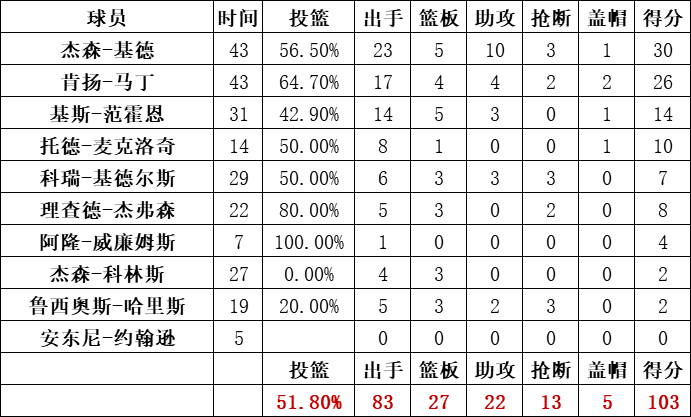 有冷门,没有波澜,湖人队卫冕看来只是时间问题。网队一度在第四节取得7分的领先优势,就在人们以为奇迹将出现的时候,布莱恩特率领湖人队扑灭了对手取胜的幻想。此役网队命中率虽提升至51.8%,但篮板球27比40输给对手13个,内线劣势一览无遗。