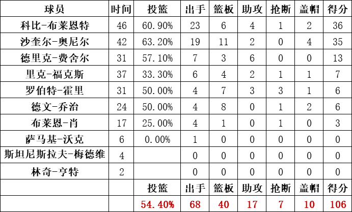 此役也是网队队史上第一场总决赛主场比赛,从场上表现来看,对奥尼尔的不断包夹虽然一定程度限制了奥尼尔的作用,但也给他的队友创造了发挥的空间,特别是布莱恩特全场23投14中独得全场最高的36分,其中第四节更是独得12分,为湖人队获胜立下汗马功劳。