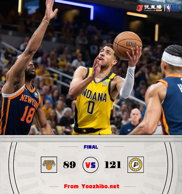 24直播网5月13日讯 NBA季后赛东部半决赛G4,步行者今日迎战尼克斯,上场比赛步行者回到主场扳回一城,目前大比分1-2落后,此役阿努诺比继续缺战。比赛上来,步行者就迅速进入状态并利用一波9-0的小高潮取得领先,分差在首节末段已经突破了二十分,整个第一节尼克斯的进攻表现糟糕只拿到14分,次节步行者依旧占据着场上的主动权,连续两个单节拿到30+的得分,半场结束时尼克斯已经落后28分;下半场回来,尼克斯还是没能扭转场上局势,三节就让步行者拿到了101分,分差也是达到了38分,比赛在末节彻底沦为垃圾时间,最终步行者大胜尼克斯,将大比分追至2-2平。