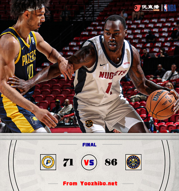 24直播网 7月19日讯  NBA夏季联赛,掘金对阵步行者。比赛开始,掘金轮番冲击篮筐频频得手很快占据主动,步行者连投带罚努力追赶,掘金持续输出保持优势,次节步行者进攻端仍不理想,掘金继续强攻内线连续拿分将分差拉开到19分,牛顿三分止血,半场战罢掘金42-26领先16分。易边再战,双方围绕两位数的分差展开拉锯战,此后掘金命中率下降,步行者连中三分缩小分差,末节两队继续缠斗,掘金连中三分再度将分差拉开到10分以上杀死比赛。最终,掘金86-71击败步行者。