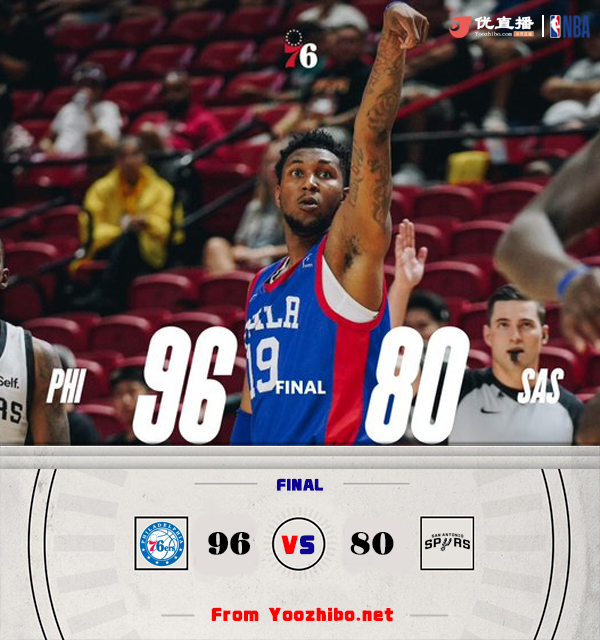24直播网 7月20日 NBA夏季联赛,76人今日对阵马刺,前者上场比赛险胜森林狼,后者则是取得四连胜,此役卡斯尔缺战。比赛上来,76人就率先进入状态打出7-0的完美开局,整个第一节马刺的进攻都很糟糕,分差很快就拉开到了两位数,次节场上局势有所反转,76人的命中率出现下降,而马刺则是找回状态,半场结束时76人领先5分;下半场回来,马刺继续追分,三节结束分差仅剩1分,末节76人重整旗鼓再次建立起两位数的领先优势,此后也没有给马刺逆转的机会,最终76人轻取马刺,终结了后者的四连胜。