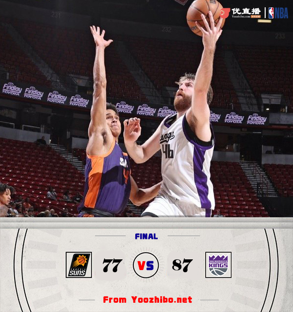 24直播网 7月21日讯 NBA夏季联赛,国王对阵太阳。比赛开始,双方势均力敌,比分咬得很紧,太阳不断冲击篮筐拿分,国王内外开花回应,次节双方继续缠斗,太阳持续发力取得微弱优势,国王里突外投迅速回应,半场战罢太阳40-38领先2分。易边再战,两队依旧打得难解难分,太阳多点开花,国王连投带罚还以颜色,末节国王持续发力打出进攻高潮将分差拉开到两位数,太阳大势已去无力回天。最终,国王87-77力克太阳。