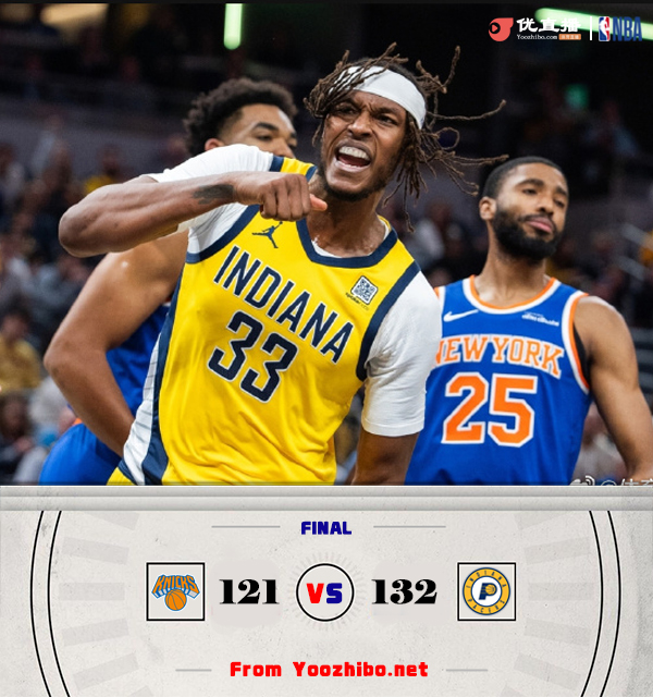24直播网11月11日讯 NBA常规赛,步行者主场迎战尼克斯。目前步行者4胜5负,尼克斯4胜4负。比赛开始,双方迅速进入状态展开对攻,哈利伯顿继续组织进攻,马瑟林连续3记三分命中,但尼克斯首发五虎也能给出回应,首节步行者领先3分,次节阿努诺比里突外投反超比分,双方展开拉锯战,哈利伯顿和布伦森展开对飚,马瑟林继续出色状态接连三分追分,半场尼克斯反超3分。下半场,唐斯打得很强硬,尼克斯一波10-0建立主动权,随后沃克连续三分一度反超,好在哈特连续突破止血,三节尼克斯依然领先2分,末节双方展开拉锯战,哈利伯顿联手马瑟林帮助步行者反超比分,随后步行者下起三分雨直接拉开双位数领先,最终步行者132-121力克尼克斯。