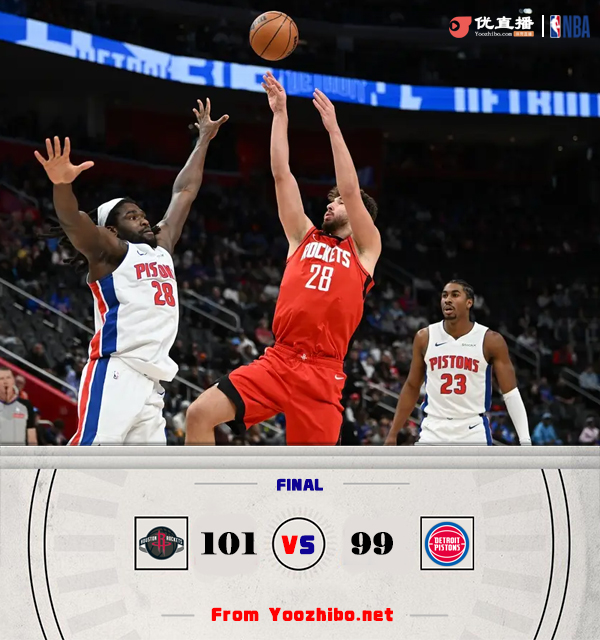24直播网11月11日 NBA常规赛,活塞主场迎战火箭。比赛开始,火箭上来反客为主打出11-2不错开局,CC和艾维接连冲击内线追分,双方后半节命中率急剧下降,首节火箭领先3分,次节活塞上来就发力一波小高潮直接反超比分,狄龙突破终于止住颓势,双方展开拉锯战,活塞始终保持微弱领先并在半场反超2分。下半场,双方命中率还是不高,但比分还是很胶着,范弗里特里突外投一度反超比分,最后3分钟火箭突然发力打出10-2小高潮取得8分领先,末节小哈达威联手比斯利接连3记三分带队轰出16-3攻击波再次反超比分,比赛进入白热化,火箭连续冲到前场篮板补篮领先到5分,哈里斯三分续命后关键传球失误,申京关键两罚中一,火箭采取“点球”战术,哈里斯绝平罚篮第一罚就不中,最终火箭101-99险胜活塞。