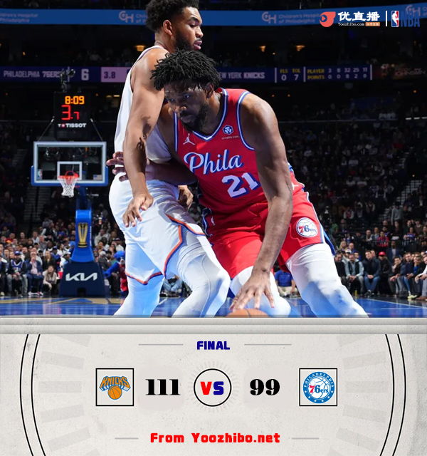 24直播网11月13日讯 NBA东部NBA杯A组,76人主场迎战尼克斯。此役76人球星恩比德迎来赛季首秀。比赛开始,尼克斯多点开花占据主动,尼克斯内外开花迅速迫近比分,次节双方继续缠斗,乔治攻防两端立功,恩比德连续造成杀伤,尼克斯多点开花强势回应,半场战罢尼克斯54-50领先76人。易边再战,布伦森崴脚一度返回更衣室,恩比德飙中三分,尼克斯持续发力取得领先,76人连投带罚迅速追赶,末节尼克斯持续发力打出11-0取得两位数领先,76人苦苦追赶无果。最终,76人99-111不敌尼克斯,主场落败。