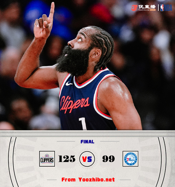 24直播网讯北京时间11月25日讯 NBA常规赛,快船对阵76人,快船最近状态不错取得4连胜,76人上场比赛击败篮网,恩比德和乔治继续缺阵。开场后快船在哈登的带领下内外开花早早建立起两位数优势,哈登手感不错单节轰下12分,76人开局手感不佳到了第一节后半段才逐渐找到手感。第二节快船进攻命中率也开始下降,主要是哈登手感下降,两队单节打成平手。易边再战,哈登再度带领快船打出攻势将分差拉大,场上分差一度达到33分。76人虽然再度后程发力追回一些分数,但第四节快船再度掌控场上局面,最终快船125-99轻取76人收获5连胜。