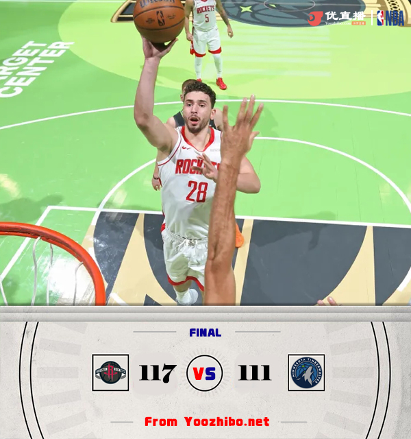 24直播网讯北京时间11月27日讯 NBA杯西部A组,火箭对阵森林狼,火箭上场输给开拓者,森林狼最近2连败。刚开场阶段火箭外线手感火热连中三分取得领先,爱德华兹带队追分,里德替补登场后手感不错帮助球队将分差缩小。第二节上来森林狼一波9-0的反扑将比分反超,范弗里特站出来连续三分稳住阵脚,阿门防守积极多次完成抢断,史密斯手感不错也连连拿分,半场过后火箭领先10分。易边再战,火箭率先发力将分差拉大,爱德华兹再次挺身而出帮助球队将比分迫近。第四节两队依旧是拉锯战,森林狼通过连续拼抢前场板反超比分,火箭则通过范弗里特的三分和阿门断球反击追平,爱德华兹绝杀不中,两队进入加时。加时赛中火箭一波11-0拿下比赛,最终火箭加时117-111送森林狼3连败。