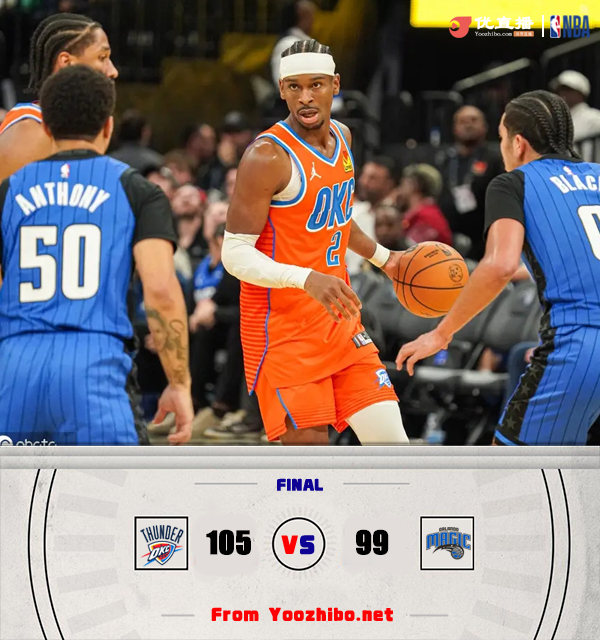 24直播网讯 北京时间12月20日讯 NBA常规赛,雷霆客场挑战魔术。雷霆刚刚不敌雄鹿无缘NBA杯冠军,但他们仍以20胜5负高居西部第一,魔术2连败,17胜11负排在东部第四。上半场,双方开场势均力敌,比分交替领先,亚历山大稳定输出,魔术多点开花予以回应,次节卡鲁索攻防两端立功带队取得两位数优势,萨格斯出现崴脚受伤,雷霆持续发力扩大优势,半场战罢雷霆65-46领先魔术。下半场,魔术奋力反击轰出22-3的进攻狂潮,末节雷霆不断冲击内线频频得手稳住局势,魔术苦苦追赶无果。最终,雷霆105-99客场击败魔术,迎来常规赛的6连胜。