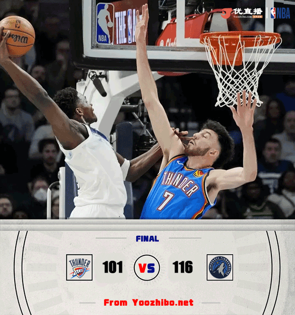 24直播网讯2月14日NBA常规赛,森林狼主场迎战雷霆。两队皆是背靠背,森林狼2连败后30胜25负排在西部第7位,雷霆则是豪取7连胜,44胜9负高居联盟榜首。本场比赛,森林狼戈贝尔和康利缺阵;雷霆卡鲁索也不打。比赛开始,亚历山大不在状态连续打铁,雷霆进攻端也受阻,而森林狼则是活力十足,爱德华兹送暴力隔扣,香农也成为奇兵,首节森林狼领先13分,次节双方展开拉锯战,杰伦威接连突破单节上双带队追分,但里德能给出回应,香农压哨勾手命中助森林狼半场还领先8分。第三节,雷霆上来就接连攻击内线一度反超比分,但沃克和里德、爱德华兹接连4记三分轰出12-0攻击波强势回应,随后双方拉锯战三节森林狼还领先10分,末节森林狼接连攻击内线一波10-2再次拉开比分,随后森林狼牢牢保持住十几分领先,双方换上替补练兵,最终森林狼116-101力克雷霆,终结对手7连胜。