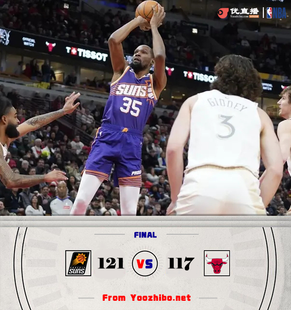24直播网讯北京时间2月23日讯 NBA常规赛,公牛主场迎战太阳,公牛5连败后22胜34负东部第10,太阳4连败后26胜29负西部第11。比赛开始,太阳很慢热打了3分多钟才通过罚球拿到首分,半节多得分还未上双,公牛9-2开局后接连三分建立主动权,首节领先10分,次节双方展开拉锯战,公牛全民皆兵保持领先,但太阳三巨头轮番发力,助队单节轰出40分半场反超2分。下半场,布克继续发力里突外投单节轰下14分,比尔也接连突破取分领先到双位数,但公牛接连3记三分三节还是追到差3分,末节太阳上来7-0再次领先双位数,但公牛外线发炮还能咬住比分,怀特2+1直接追平,杜兰特接连罚球,布克三分再进,布克接连不讲理三分杀死比赛,最终太阳121-117力克公牛,终止4连败同时送对手6连败。