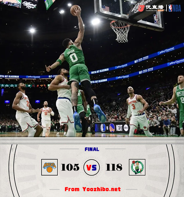 24直播网讯北京时间2月24日讯 NBA常规赛,凯尔特人主场迎战尼克斯,凯尔特人4连胜后40胜16负稳居东部次席,尼克斯则是37胜19负排在东部第3位。本场比赛,哈特迎来复出。比赛开始,绿军先发五虎都得分带队打出13-3不错开局,哈特和布伦森接连单打止血,但豪泽连续外线发炮,塔图姆接连突破还是领先到19分,次节佩恩连砍7分助队10-2迅速追分,波尔津吉斯攻防建功助队稳住局势,塔图姆干拔三分再中助绿军半场领先21分。下半场,唐斯反弹里突外投得分迅速上双,但双探花外线能回应,布伦森连砍12分助队打出23-5攻击波一度追到个位数分差,末节怀特接连三分助队稳住局势,唐斯受伤好在无碍,杰伦-布朗发力连砍11分带队重新拉开20分领先,最终凯尔特人118-105击退尼克斯,拿到5连胜。