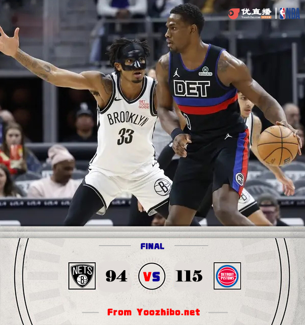 24直播网讯北京时间3月2日讯 NBA常规赛,活塞今日迎战篮网,前者上场比赛输给掘金,后者则是遭遇三连败,此役拉塞尔、小托马斯、克洛尼和艾维等人缺战。比赛上来,场上就呈现出一边倒的局势,篮网在半节的时间里只拿到4分,而活塞这边杜伦统治了攻防,在他的带领下球队也是打出19-4的完美开局,比斯利上场后连中三分,活塞单节轰下39分,次节活塞依旧占据着场上的主动权,分差也是突破了二十分,半场结束时篮网落后23分;下半场回来,活塞的进攻出现大问题,单节只拿到13分,尤其是三节节末连续出现失误被篮网追到个位数,末节活塞重整旗鼓,双方也是火药味十足,比斯利挑衅观众被驱逐,不过分差一直在十分以上,最终活塞轻取篮网,送给后者四连败。