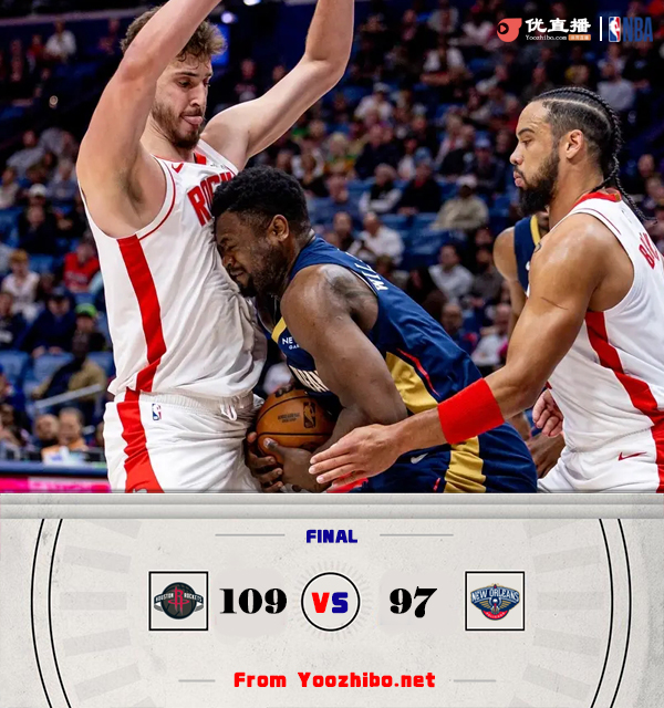 24直播网讯北京时间3月7日讯 NBA常规赛激战正酣,火箭和鹈鹕两支青年军正面对话,火箭遭遇3连败战绩来到37胜25负,暂列西部第5位,鹈鹕17胜45负排在西部倒数第二。首节开打后墨菲连拿7分率队占优,火箭内外结合及时回应,但墨菲无人可挡单节狂揽15分,鹈鹕领先3分结束首节争夺,次节回来,火箭始终无法打出追分高潮,鹈鹕稳扎稳打保持优势,半场战罢,鹈鹕依然领先3分。易边再战后鹈鹕进攻停滞,申京和杰伦-格林轮番冲击,末段鹈鹕进攻依然毫无起色,火箭顺势拉开比分,三节结束后火箭确立15分优势,末节上来,锡安连造杀伤率队追分,但火箭总能给予回应,最终火箭109-97击败对手,终结3连败的同时也终结客场8连败。
