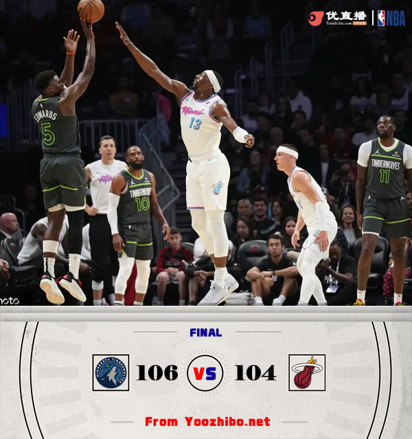 24直播网讯北京时间3月8日讯 NBA常规赛激战正酣,热火主场迎战森林狼,森林狼近期迎来三连胜,35胜29负紧追勇士位列西部第7,热火29胜32负排在东部第7。此役一上来双方便陷入缠斗,阿德巴约连投带罚不断取分,兰德尔联手康利及时回应,森林狼中段开始发力确立优势,首节结束时森林狼领先8分,次节回来,森林狼始终保持领先,但末段他们进攻突然断电,热火顺势抹平分差,半场战罢,两队战成52平。易边再战后森林狼再度发力将分差拉开到两位数,阿德巴约和希罗内外结合强势回应,双方战成80平进入末节,末节决战,两队鏖战至最后时刻,里德和麦克丹尼尔斯连中抛投,森林狼连丢罚球后阿德巴约三分绝杀未果,最终森林狼106-104涉险过关。