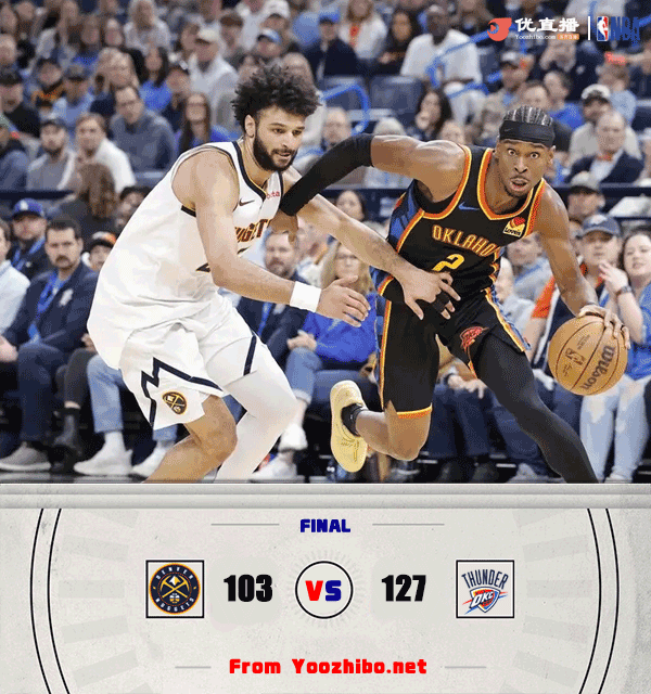 24直播网讯北京时间3月10日讯 NBA常规赛今天迎来一场强强对话,雷霆主场对阵掘金。雷霆52胜11负高居西部第一,掘金41胜22负排在西部第二。比赛开始,掘金反客为主率先发力,打出10-0的开局,亚历山大连续单打得手带队追赶,此后双方陷入缠斗,掘金多点开花,亚历山大得分助攻一肩挑还以颜色,杰林-威廉姆斯连中三分,布劳恩连得7分迅速回应,半场战罢雷霆61-60领先掘金1分。易边再战,亚历山大和霍姆格伦先后打成2+1带队扩大优势,双方围绕10分左右分差展开激烈争夺,约基奇和穆雷联手拿分带队追赶,末节雷霆占得先机,连投带罚重获两位数优势,掘金苦追赶无果,最终,雷霆127-103击败掘金,主场过关。
