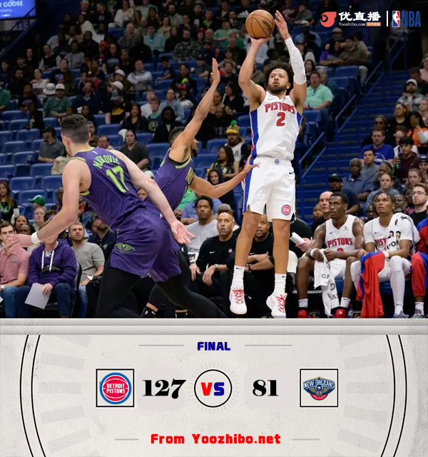 24直播网讯北京时间3月18日讯 NBA常规赛,鹈鹕主场迎战活塞,鹈鹕18胜50负西部第14,活塞37胜31负东部第6,两队目前都是2连败。比赛开始,墨菲上来就手腕受伤回更衣室,活塞首发五虎多点开花打出17-7开局,随后活塞接连扣篮继续扩大领先,鹈鹕首节仅得13分落后到22分,次节康宁汉姆带领活塞继续发力拉开30分以上领先,锡安和麦科勒姆始终找不到手感,阿尔瓦拉多外线7中0,半场活塞领先31分。下半场,活塞进攻端受阻半节未上双,锡安带队接连攻击内线追至20分以内分差,胆康宁汉姆能站出来回应,三节活塞依然领先25分,末节丰泰基奥连中三分助队重新拉开30分以上领先,双方换上替补练兵,活塞扩大到40分以上领先,最终活塞127-81大胜鹈鹕,送对手3连败。