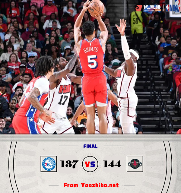 24直播网讯北京时间3月18日讯 NBA常规赛今日继续开打,火箭今日坐镇主场迎战76人,76人伤兵满营本场多达11人受伤缺席比赛。首节对决双方状态都出人意料,防守效率联盟高居第二的火箭首节被伤兵满营的76人轰下44分,进攻端杰伦-格林和狄龙首节合计14中1直接导致落后16分;次节火箭防守端依旧无法阻止对手,76人半场轰进15记三分,命中率超过60%并带着21分领先进入下半场。休息归来杰伦-格林回暖主导进攻,他单节拿下10分的同时送出7次助攻,火箭在第三节以惊人的73.9%命中率狂轰45分并单节抹掉最多25分劣势。末节76人在格莱姆斯的带领下送上10-0的攻势重新确立起领先,火箭无奈再度换上杰伦-格林并稳住局面紧追比分,不过火箭场面惨烈伊森6犯离场外加范弗利特二级恶犯被驱逐,不过被雪藏整个下半场的申京最后补篮自我救赎拖入加时。加时赛申京一扫阴霾上来打成2+1,随后杰伦-格林和小史密斯外线轰进三分确立起主动,格莱姆斯的两记三分为76人咬住比分,不过火箭最后顶住压力守住优势。最终,火箭在最多落后25分的情况下上演极限逆转加时力克76人取得7连胜。