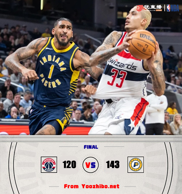 24直播网10月26日讯 NBA常规赛,奇才客场挑战步行者。上半场,奇才率先发力占据主动,步行者连中三分迅速回应,奇才持续发力打出12-3的攻击波,步行者多点开花还以颜色,次节步行者利用防守反击完成反超,布鲁斯-布朗和希尔德相继飙中三分,半场战罢步行者73-68领先奇才。易边再战,奇才命中率骤降,步行者稳扎稳打不断扩大领先,末节奇才仍无起色,步行者持续发力将分差拉开到20分以上,在还剩半节多的时间里奇才换下主力投子认负,最终,步行者主场143-120大胜奇才。