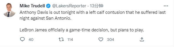 24直播网11月27日,湖人背靠背对阵马刺赛前,湖人队更新伤情,据湖人记者Mike Trudell报道,詹姆斯将会继续出战,浓眉则因新伤(左小腿挫伤)而缺席比赛。